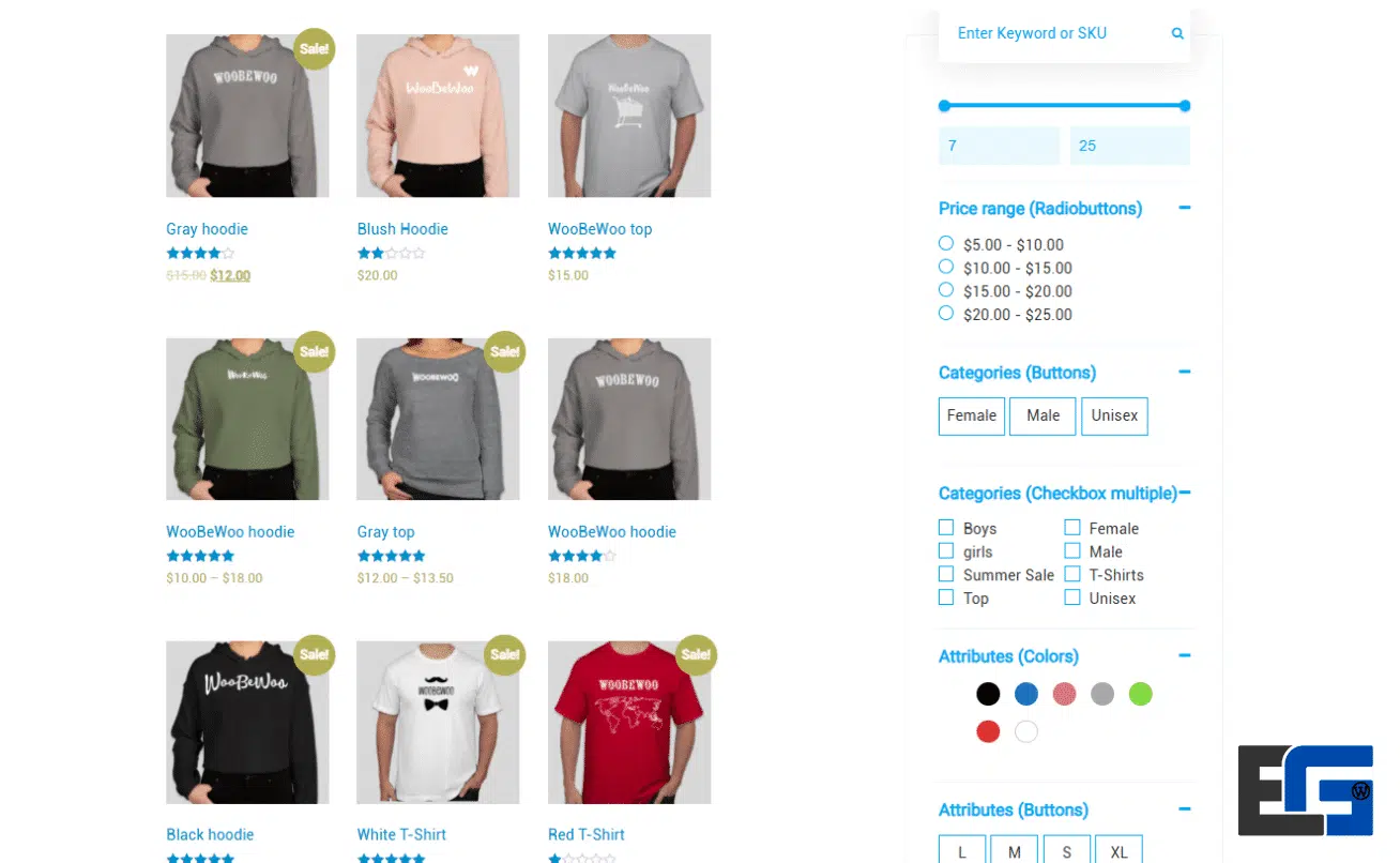 The plugin allows you to create a variety of filters, including checkboxes, drop-down lists, and color swatches. You can filter products based on attributes such as categories, tags, price ranges, and custom attributes.